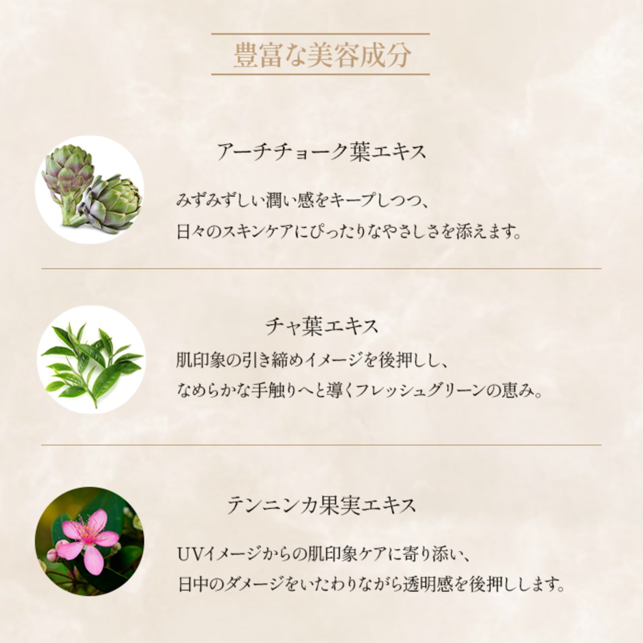 シクロペンタシロキサン、メチルトリメチコン、水、酸化亜鉛、酸化チタン、PEG-10 ジメチコン、イソノナン酸イソノニル、水酸化 AI、アルミナ、メチコン、ポリプロピレルシルセスキオキサン、BG、フラーレン、スクワラン、シア脂、コメ胚芽油、ポリグルタミン酸、テンニンカ果実エキス、アーチリョーク葉エキス、チャ葉エキス、ゲンチアナ根エキス、タベブイアインペチギノサ樹皮エキス、ビルベリー葉エキス、オウゴン根エキス、ビオサッカリドガム -4、加水分解アルギン、クリサンテルムインジクムエキス、グリチルレンチン酸ステアリル、ジフェニルシロキシフェニルトリメチコン、トリメチルシロキシケイ酸、ポリヒドロキシステアリン酸、イソステアリン酸、オクテニルコハク酸デンプン AI、PEG-9 ポリジメチルシロキシエチルジメチコン、ジメチコノール、グリセリン、シリカ、硫酸 Mg、フェノキシエタノール