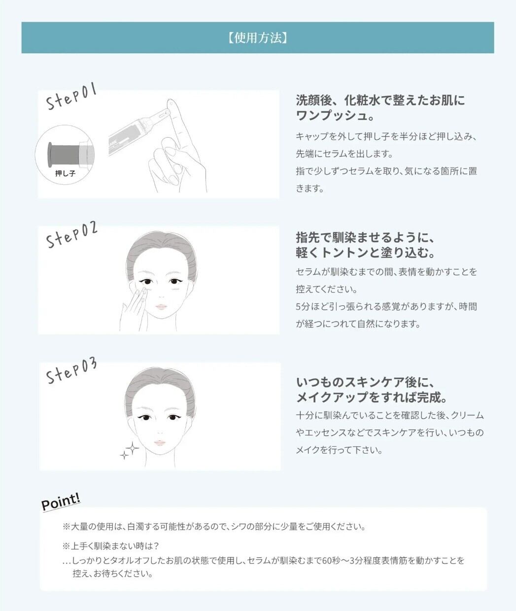 ...しっかりとタオルオフしたお肌の状態で使用し、セラムが馴染むまで60秒〜3分程度表情筋を動かすことを控え、お待ちください。