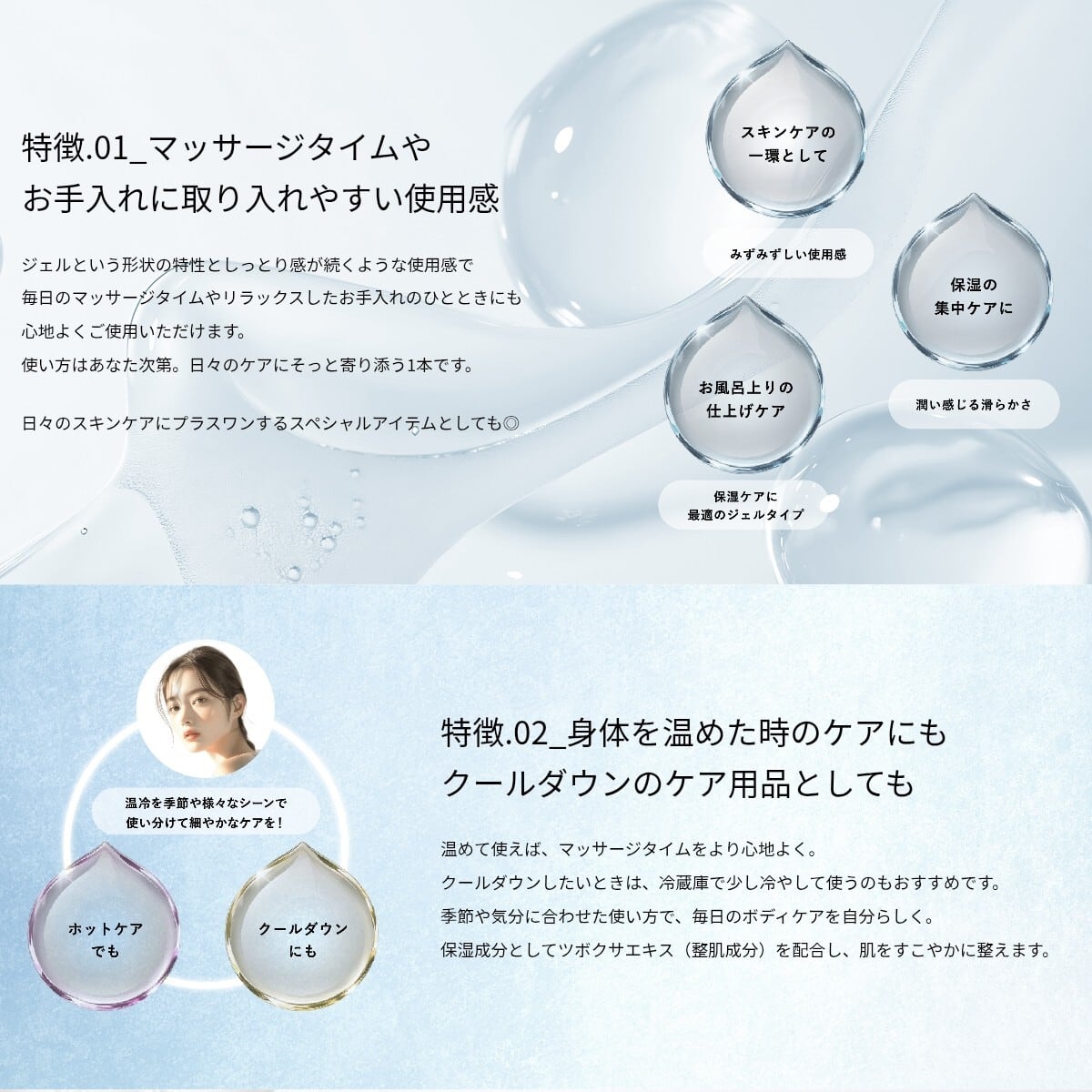 マッサージタイムやお手入れに取り入れやすい使用感ジェルという形状の特性としっとり感が続くような使用感で毎日のマッサージタイムやリラックスしたお手入れのひとときにも 心地よくご使用いただけます。