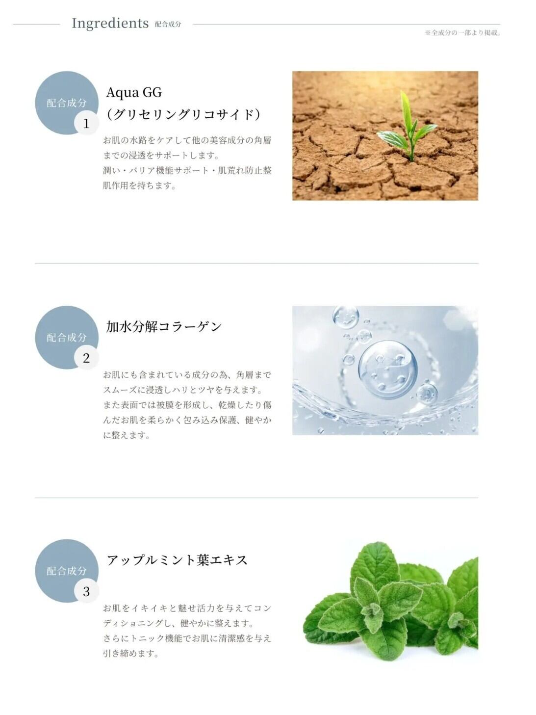 加水分解コラーゲン、水、グリセリン、1,2-ヘキサンジオール、ナイアシンアミド、ベタイン、パンテノール、ポリアクリレート-13、トリ(カプリル酸/カプリン酸)グリセリル、セスキオレイン酸ソルビタン、ジメチコン、ポリイソブテン、水添レシチン、グリセリルグルコシド、異性化糖、ポリソルベート20、イソステアリン酸ソルビタン、ダイヤモンド末、コロイド性ダイヤモンド、β-グルカン、加水分解カイメン、アップルミント葉エキス、チャ葉エキス、タチジャコウソウ葉エキス、エチルヘキシルグリセリン、アルギニン、カルボマー、キサンタンガム、クエン酸Na、クエン酸、アデノシン、EDTA-2Na、ベルガモット果実油、ラベンダー油、ローズマリー葉油、リモネン、リナロール