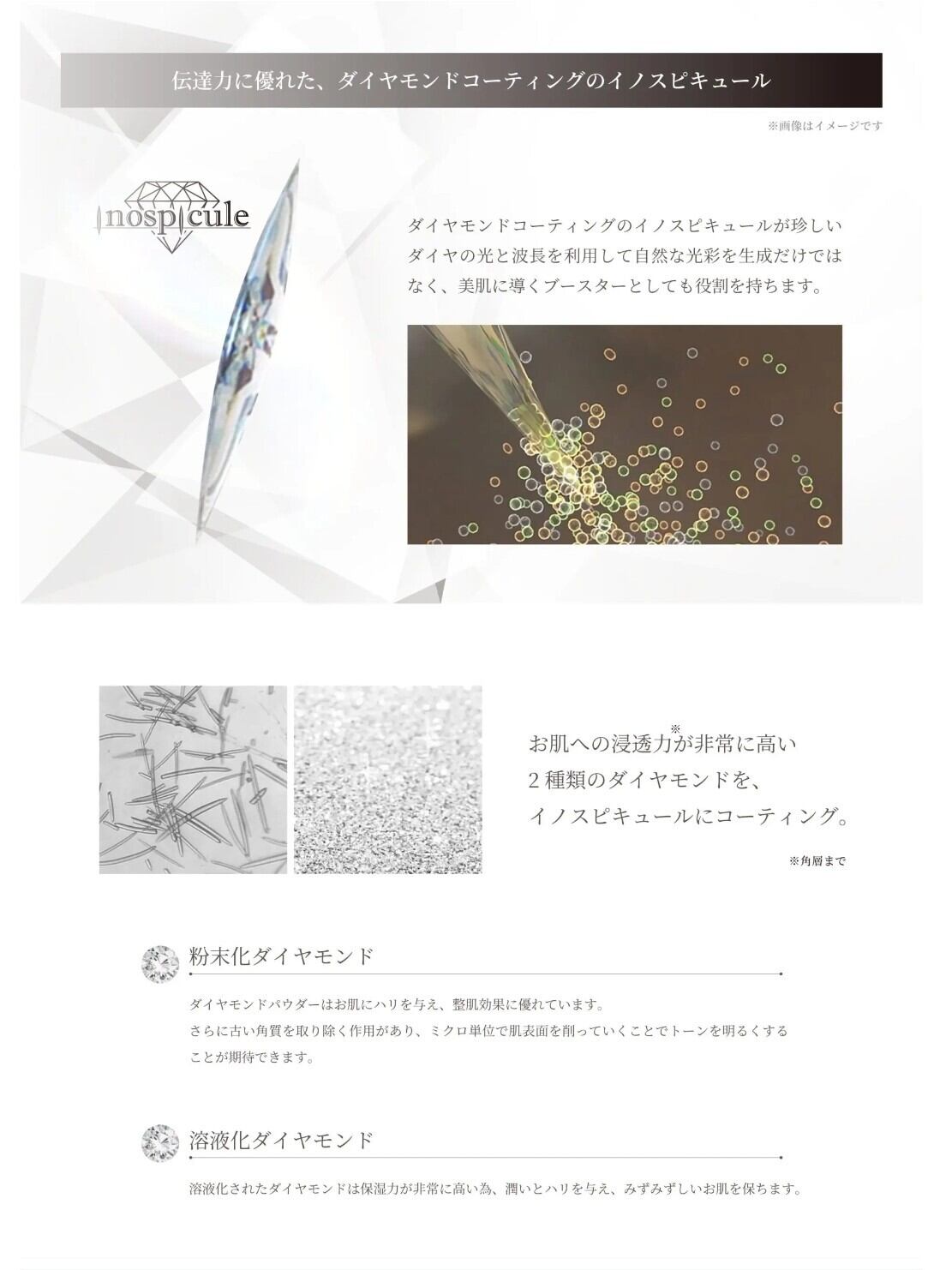 さらにお肌への浸透力が非常に高い2種類のダイヤモンドをイノスピキュールにコーティング。