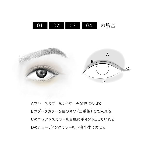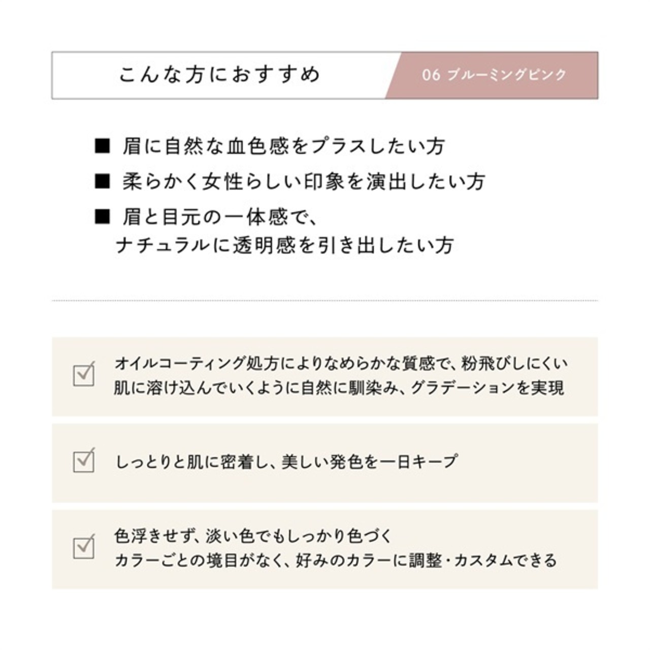 ベージュ~ブラウンの配色で、目元に立体感を与え、自然でナチュラルな印象に。シーンを問わず使いやすい万能カラー。